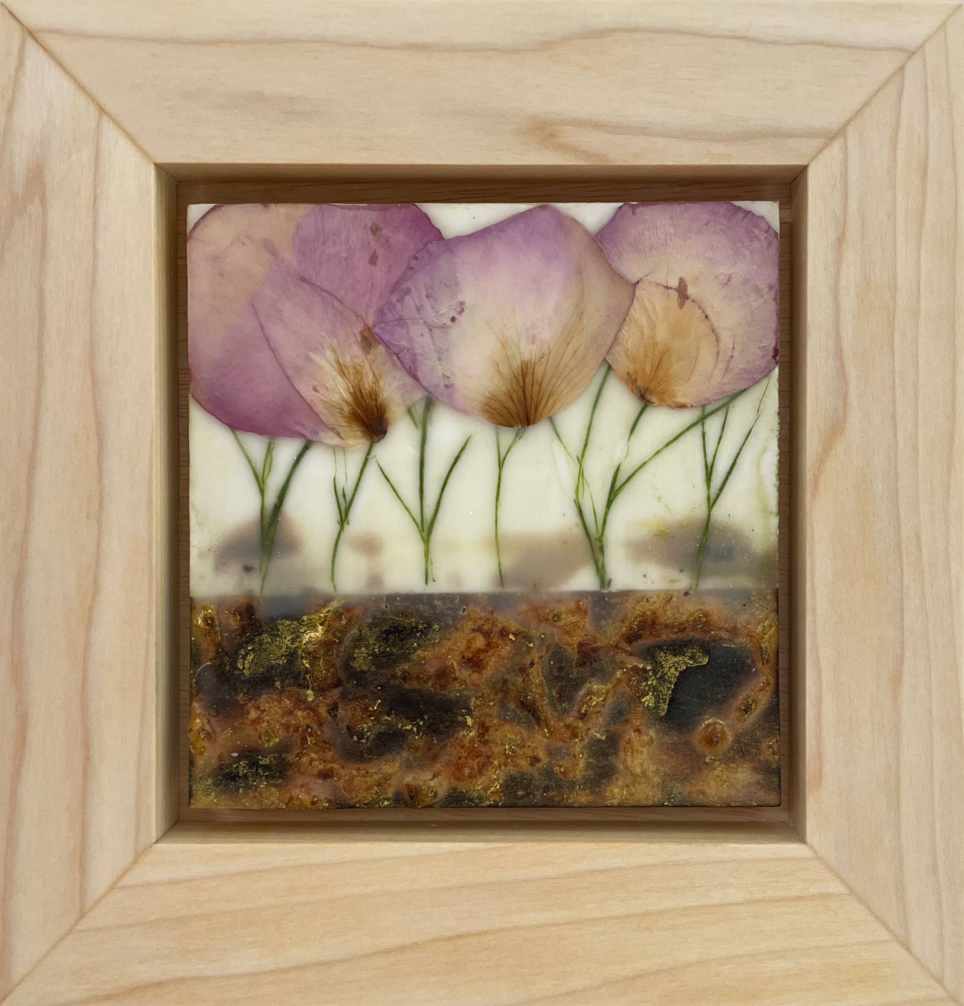 As a mixed media artist I tend to save everything. A long time ago, I took apart a rose and saved the petals, not having a plan for what I would do with them. I came across them and saw a little garden, a flower in each petal. The bottom portion of this painting was created by adding wood glue to a birch wood substrate, and burning it. It creates this beautiful coppery color and great texture.