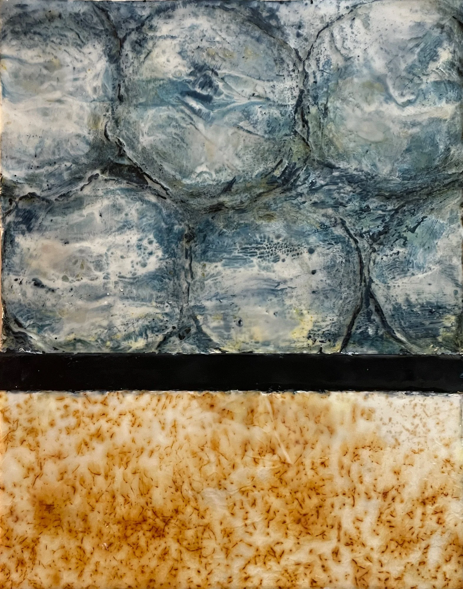 As a mixed media artist I love incorporating different materials into my designs. In this piece I use a textured paper (the circles) as a starting point for the upper portion of the painting, then added indigo encaustic paint - one of my favorite colors. The lower half is paper that I rusted, embedded in encaustic medium.