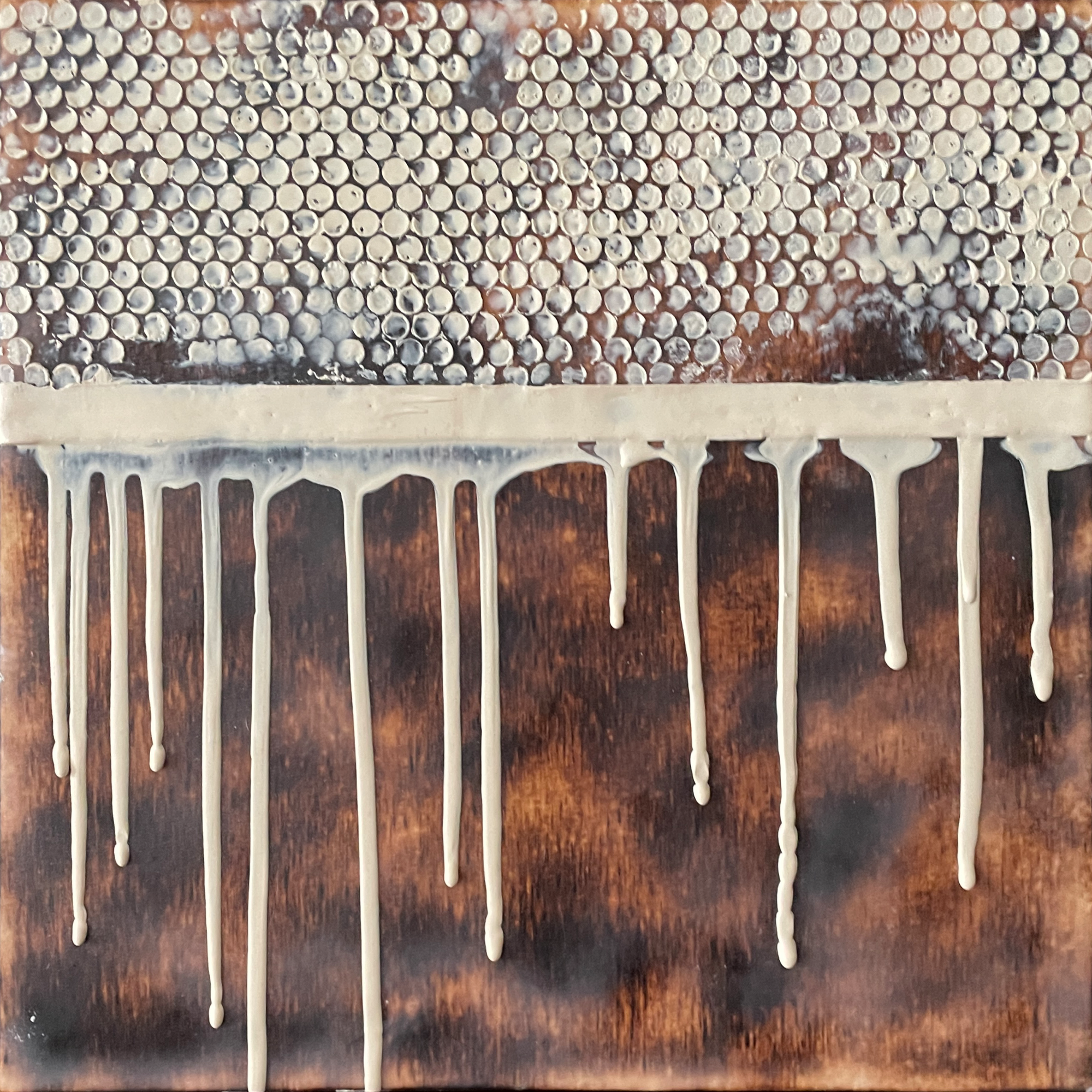Painting on a wood substrate adds a layer to my painting process. The wood itself became a part of this work. I started by burning the wood by heating it with the torch. It created this lovely brown, mottled look. That was my starting point, and the rest of the painting unfolded.