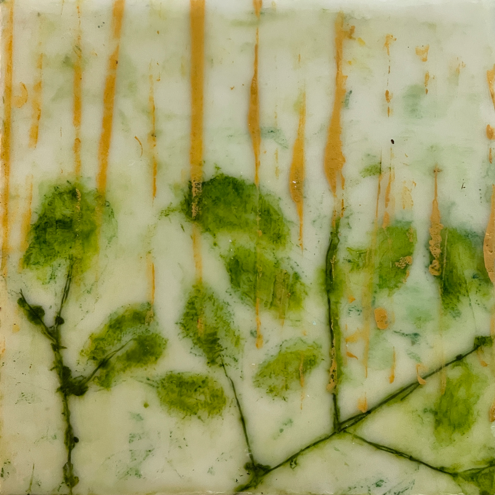 I created this little piece during a studio day of play and exploration, and I just fell in love with the result. The leaves are a monoprint using the last leaves of summer, and a little mark making.